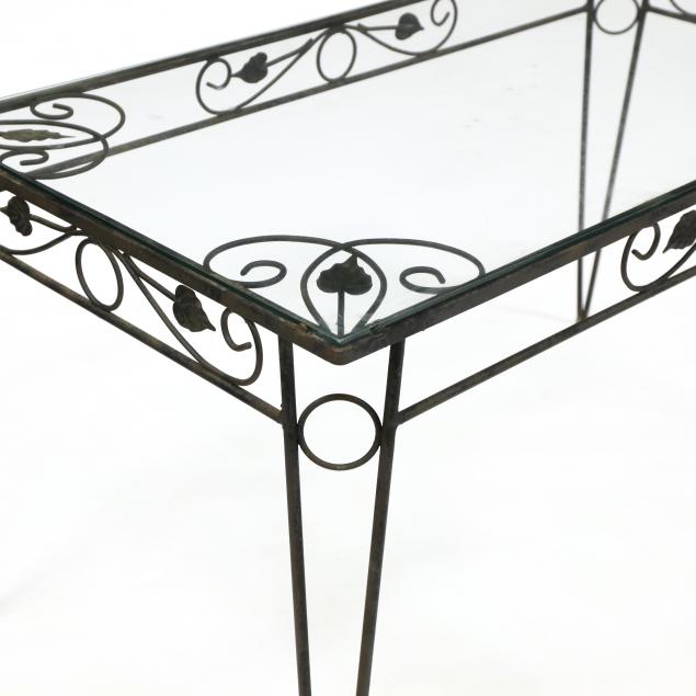Mid 20th century, black painted iron, rectangular table with glass top, together wh four side chains with slip seats, featuring scrolled and foliate decoration, unmarked.