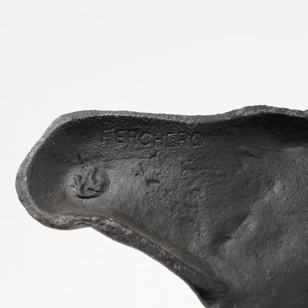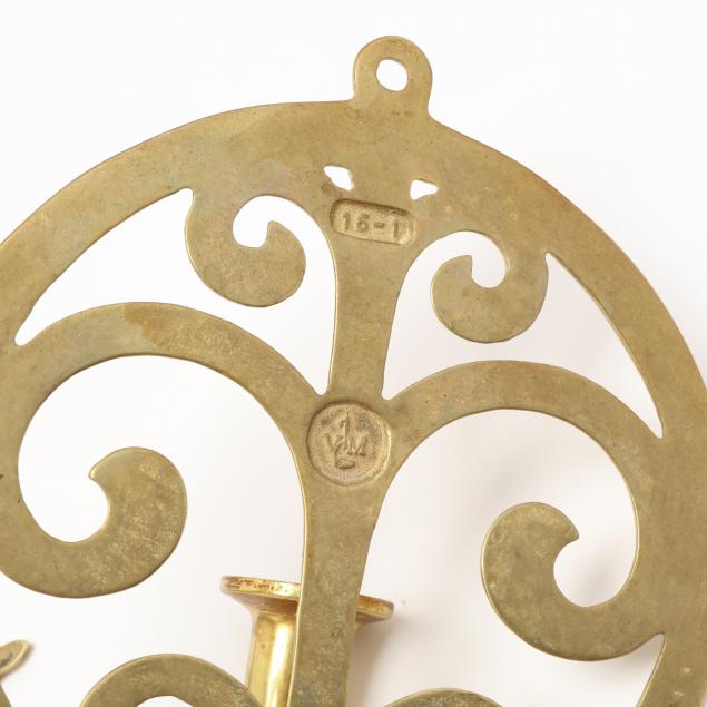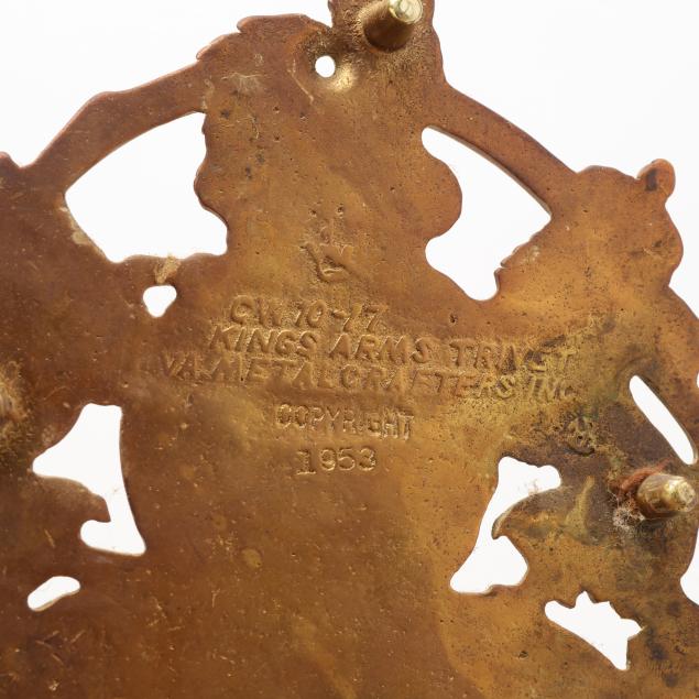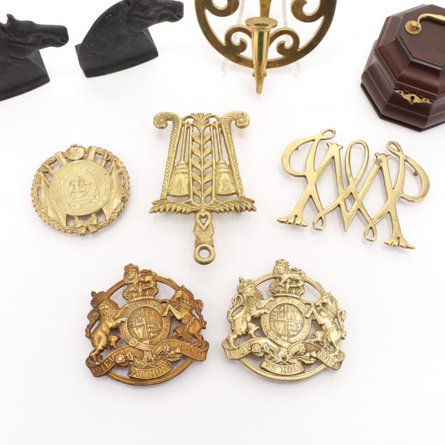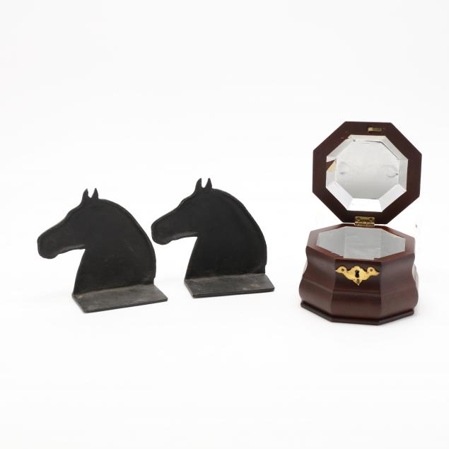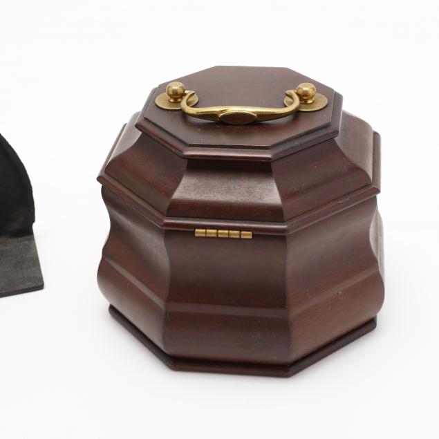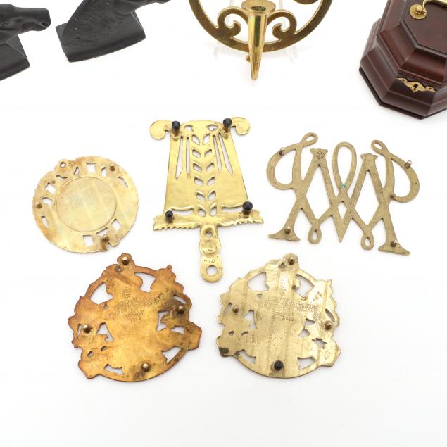 Mid to late 20th century, most for Colonial Williamsburg, to include an octagonal mahogany tea caddy, pair of black-painted aluminum horse head bookends, single sconce, five brass trivets.