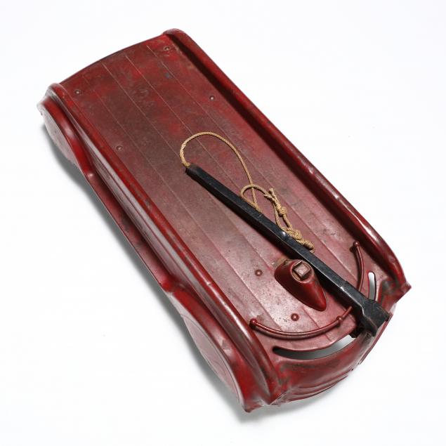 1940s-50s, red painted pressed steel body, swivel metal pull handle.
