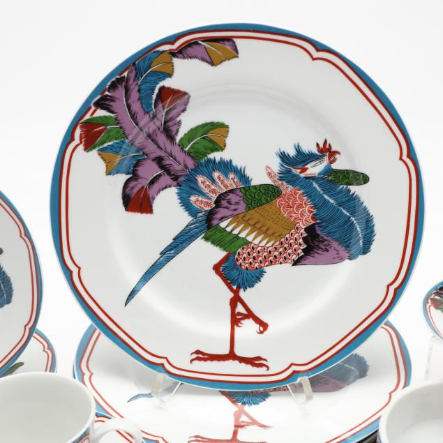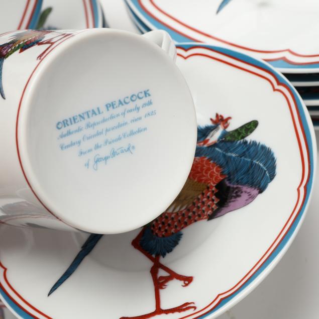 Six plates (10.25 in.) (one plate with 1/2" rim chip); six small bowls; six cups and six saucers; six plates (7.5 in.) (two with very small edge nicks). The design is a reproduction of Oriental porcelain circa 1825.