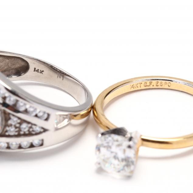 To include a white gold ring with prong set marquise and channel set colorless stones, stamped 14K (ring size 5.75); a yellow gold ring with central prong set, emerald cut aquamarine stone flanked by six full cut round diamonds weighing approximately .24 total carat (I-J color, SI clarity), stamped 14K (ring size 6); and a gold filled solitaire ring with colorless stone, stamped 14KT G.F. ESPO (ring size 6).