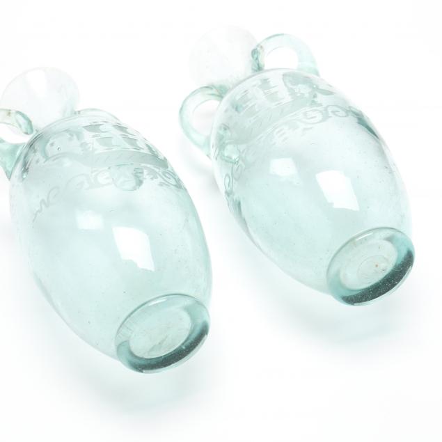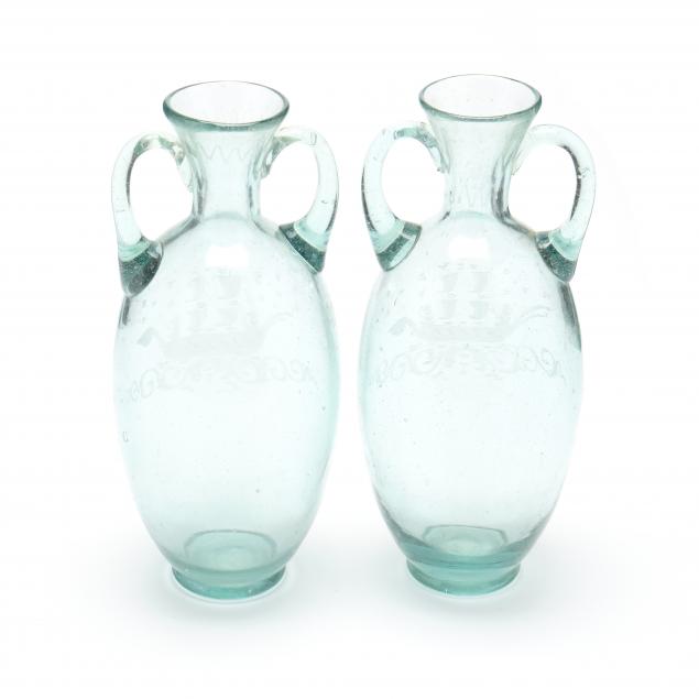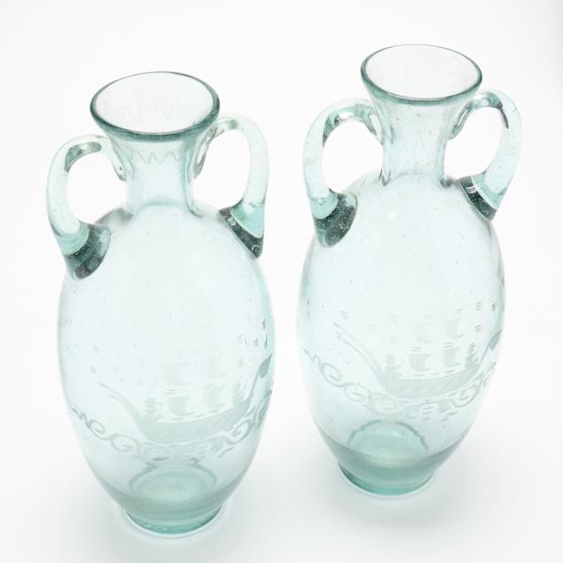 Pale green glass with attractive air bubbles, each etched with a pictorial scene of ships at full sail, each with double loop handles.