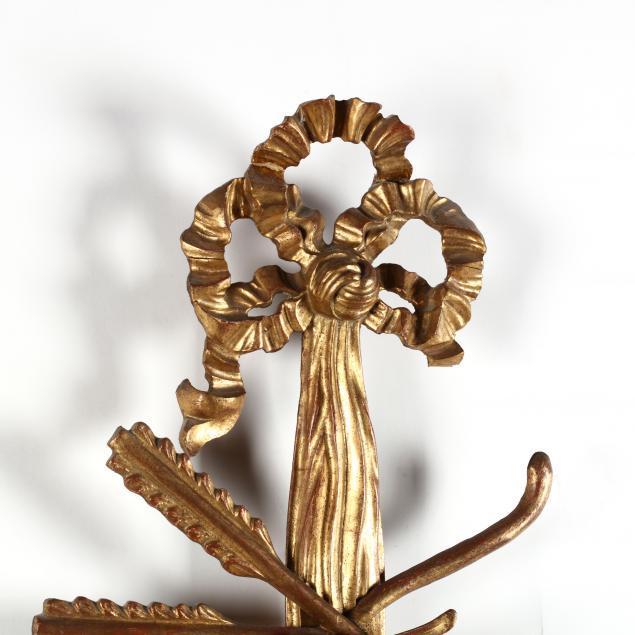Some minor gilding loss, break and repair to top bow of one sconce.