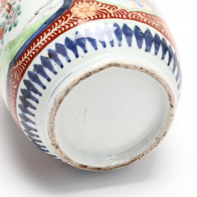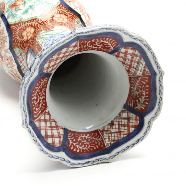 19th century, a large oval tray decorated with peony blossoms and a pair of pheasants in the center, the wide rim with circular medallions containing temple landscapes and textile patterns against a gilt and iron red ground, marked with six character mark of Hisatomi Yojibei Masayasu to underside, and a tall vase with barbed rim, shaped vignettes with cobalt blue border containing landscapes or birds and flowers, same iron red and gilt ground as tray.