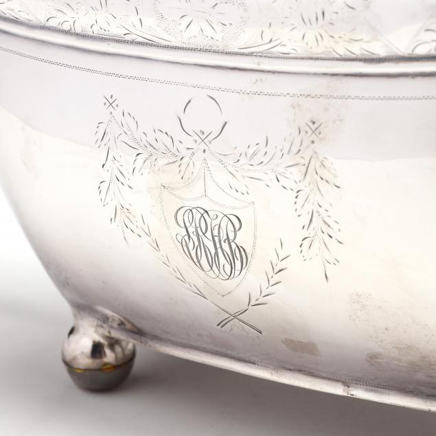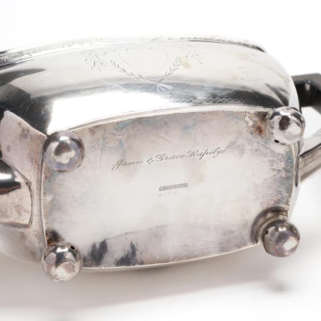 Teapot with minor bending to silver cap on handle, handle is slightly loose, wear to engraved decoration, one ball foot is replaced, minor mis-shaping and slight seam separation to spout, light scratching; the sugar bowl with wear to engraved decoration, several minor scattered dents, light scratching.
