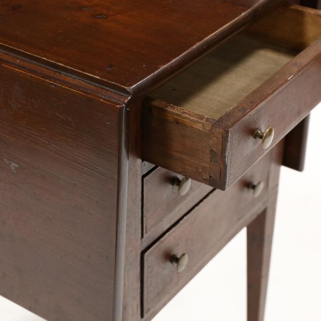 First half 19th century, yellow pine and poplar secondary, drop leaves with slide support, three graduated drawer ith banded inlay, with line inlaid stiles and lower edge, raised on square tapered legs with Bellflower and line inlay.