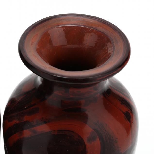 19th century, baluster form red Peking glass vases with marbling of swirling red, dark red, and black coloring.