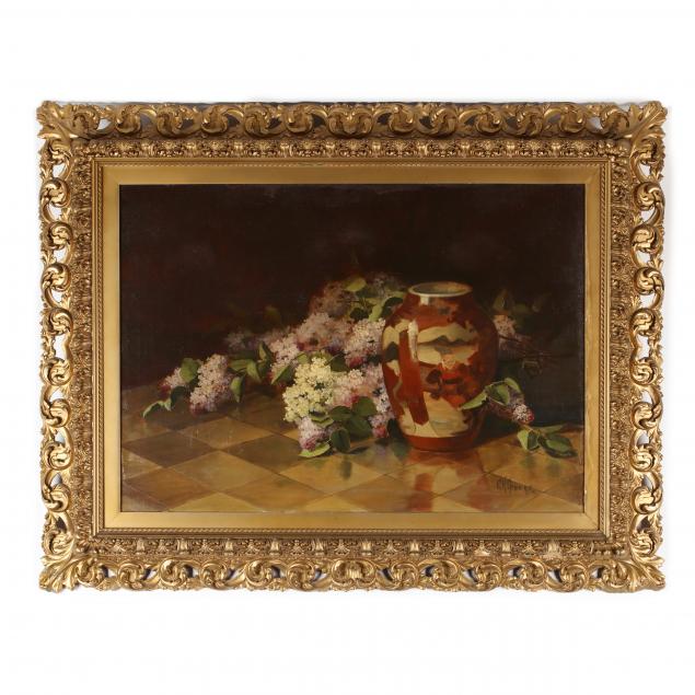 Oil on canvas laid on Masonite, signed at lower right, presented in an ornate antique gilt Florentine style frame.
