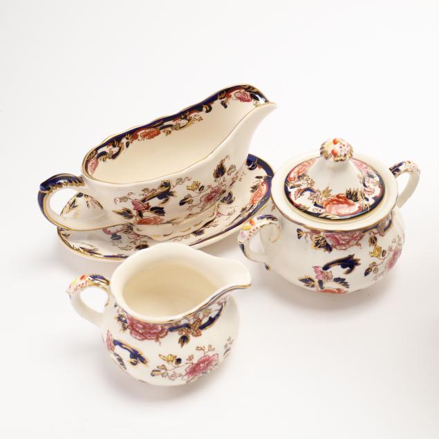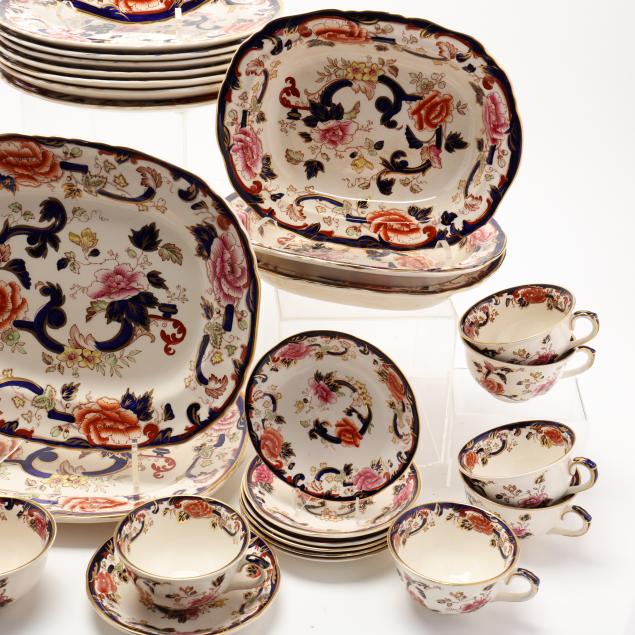 Made in England, 20th century, to include: eight plates (10 3/8 in.) (one with crazing and pinpoint nick to the underside edge); nine plates (9 1/8 in.) (three with upper rim chips; one with underside darkening); eight plates (5.75 in.) (one with upper surface bruise); eight cups and eight saucers; gravy boat with tray, cream jug, covered sugar; three serving bowls (1.75 x 10.25 in.) (one with crazing and darkening to interior); two platters (13 1/8 in.).