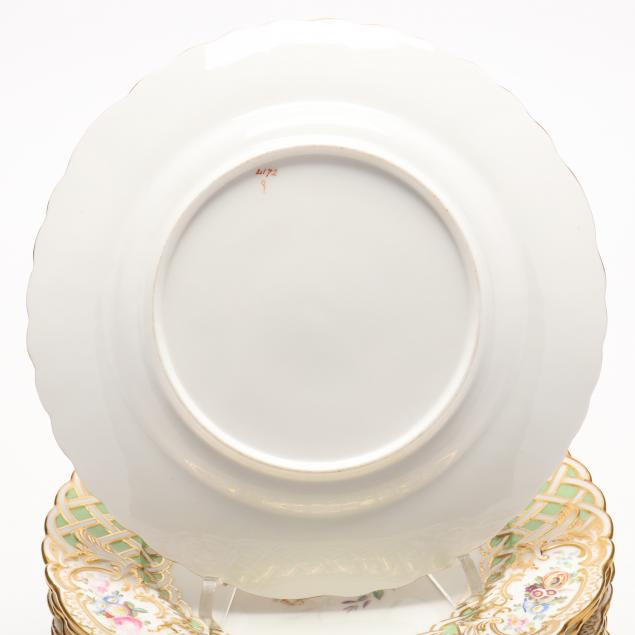 (19) pieces including: (12) plates with pattern number 4172, unknown manufacturer (possibly Copeland), each with floral spray to well, molded lattice motif to rim with pale green ground (9.25 in. diameter) (several plates with minor wear to central floral decoration); and a set of (7) rimmed soup plates with yellow borders and gilt decoration, marked Copeland China, pattern number 6499 (9.25 in. diameter) (three with wear to gilt medallion, two with one hairline each to rim, three with fleabites to rim edge).