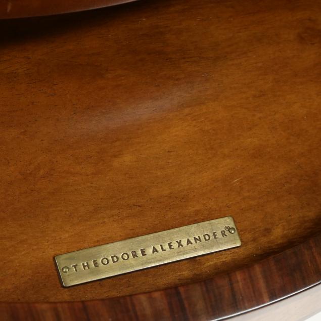 Contemporary, burlwood, coromandel, mahogany, and maple veneers, contemporary, circular form, circular fan inlay to top, banded edge, single banded drawer, inlaid tapered legs with shaped inlaid shelf, on brass feet, labeled.