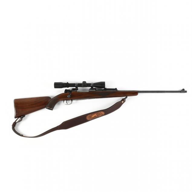 Mid-20th century, approximately 9mm bore, checkered walnut stock; serial numbers 40113 on receiver and 43083 at breech with waffen markings; fitted with Burris 3X-9X scope plus American leather sling and rubber buttplate. This rifle will require FFL transfer.