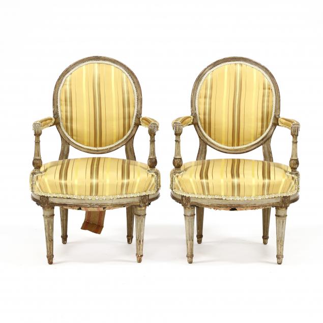 The Collection of Mr. Duggins and Mr. Dunn, High Point, North Carolina Likely original paint with chipping and loss; later silk upholstery, one chair with chip to rear crest rail.