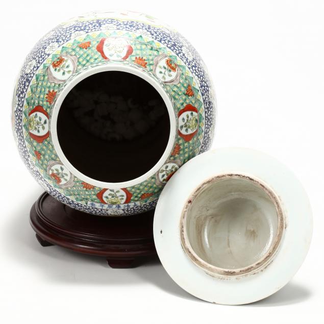 Late 20th century, decorated in famille verte palette with shaped registers containing birds and flowers, domed cover with lion finial, floral apocryphal inscription to shoulder of vase, comes together with wooden stand.