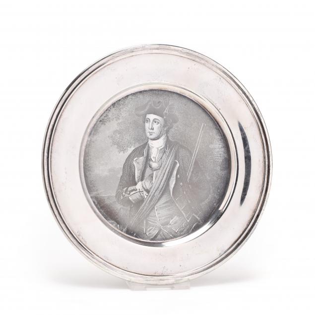 A small plate featuring an engraved image of George Washington after the 1777 portrait of the colonel by Charles Wilson Peale, 1972, marked and with original label to underside.