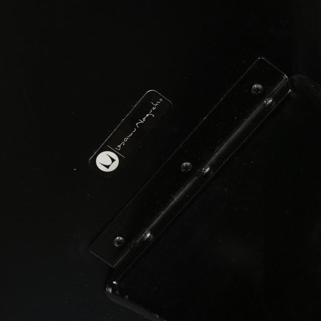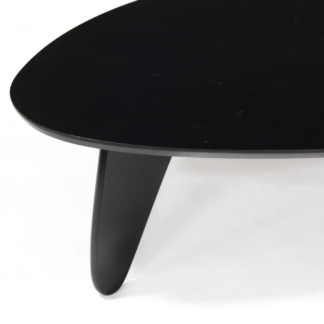 Herman Miller, contemporary production after the 1949 original, shaped black laminated top, black laminate and polished steel hairpin legs, labeled.