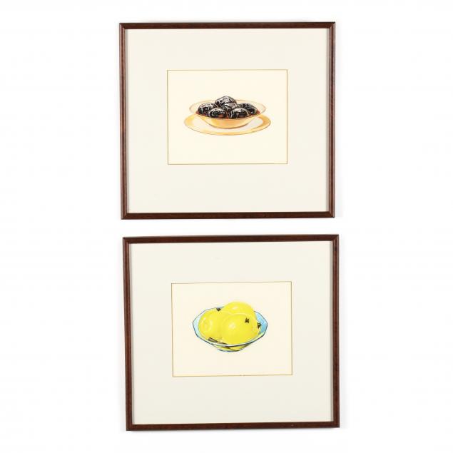 Watercolor and gouache on paper, cut and mounted to backing, circa 1930s, retain labeling to verso, one depicts prunes in the bowl and the second depicting peaches with cloves, presented in uniform matting and framing.