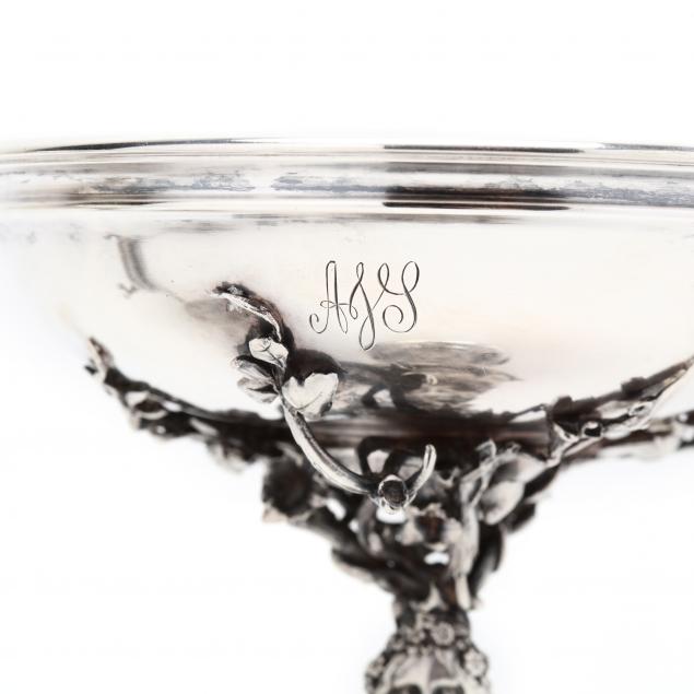 Primavera by Sandro Botticelli, the second featuring a model of Mercury after Giambologna, each raised on a domed circular foot with chased floral motifs alternating between female masks and shells in high relief, the bowls each with period armorial engraving of a stag's head and the monogram "AJS."