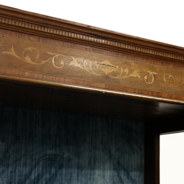 Circa 1900, two part form, upper case with inlaid faux dentil molded cornice, urn and scroll inlaid frieze, hinged beveled glass door, blue velvet lined interior with shelves, the door surround and stiles with banded inlays, lower bowfront case with banded edge inlay, hinged door with urn and scroll inlay, raised on square tapered legs with pad feet.