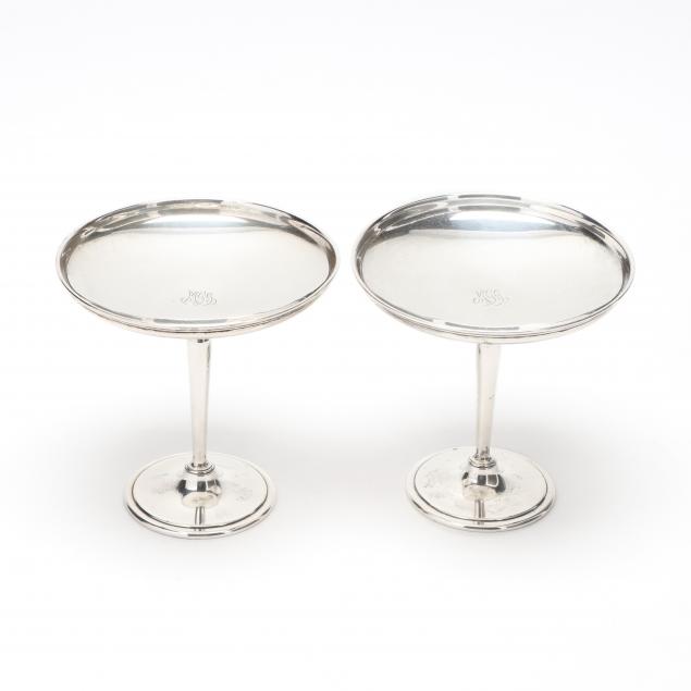 Circa 1907-1947 period hallmark, pattern number 19754, elegant form with shallow bowl raised atop a slender tapered standard with conforming foot, period monogram "MGJ" to wells.