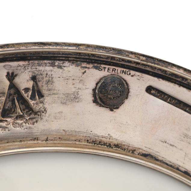 Featuring a Lenox cobalt and gilt decorated plate with applied sterling silver rim featuring imagery of the American West and engraved "Trap Shooting / 1949 / Class B / 2nd," the verso of the rim with button reading "Lindemann / San Francisco / Jewelry Co."