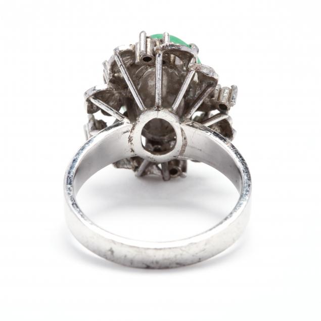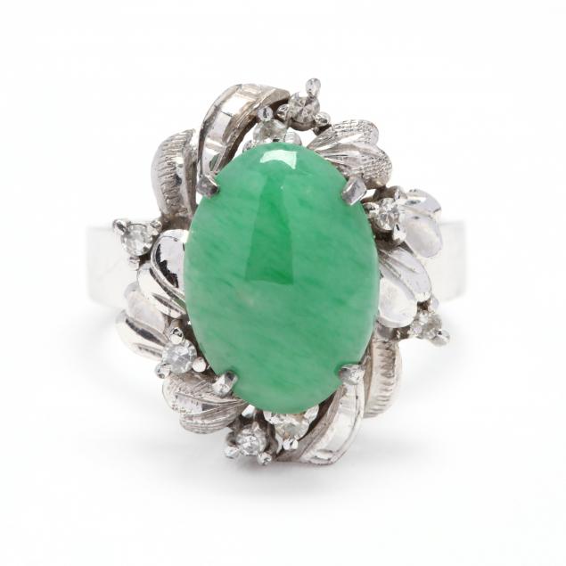 Mount designed in a foliate motif centering on an oval cabochon medium green jadeite (12.5 x 9.2mm) and with eight prong set single cut round diamond accents (1.5mm) weighing approximately .10 total carat (H-I color, SI1 clarity), stamped 18K.