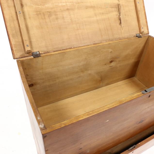 Late 19th century, white pine, single board hinged lid, open interior, over two flush drawers, raised on bootjack feet.