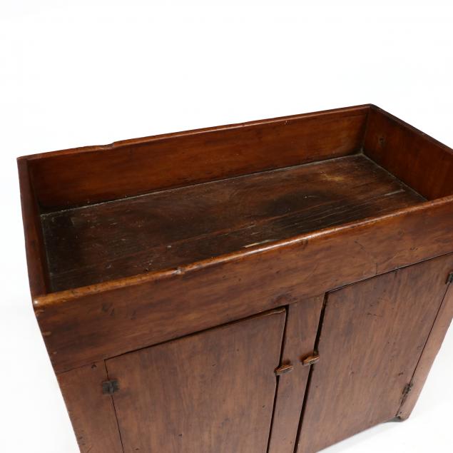 Late 19th century, white pine, rectangular top with full surround, single board sides, two hinged doors with shelved interior on short shaped bracket feet.