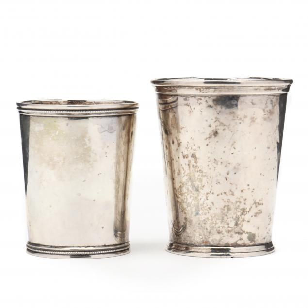 The first is marked for Peter Krider of Philadelphia, circa 1850-1860, retailed by John B. Akin of Danville, Kentucky, no monograms (4 in.) (scattered denting and minor surface scratches, small nicks to upper and lower rims); the second is marked for Jaccard & Co. of St. Louis, Missouri, circa 1852-1864, slightly tapered cylindrical form with beaded rim and foot, no monograms (3.5 in.) (slightly out-of-round, scattered minor pinpoint dents to base and body).