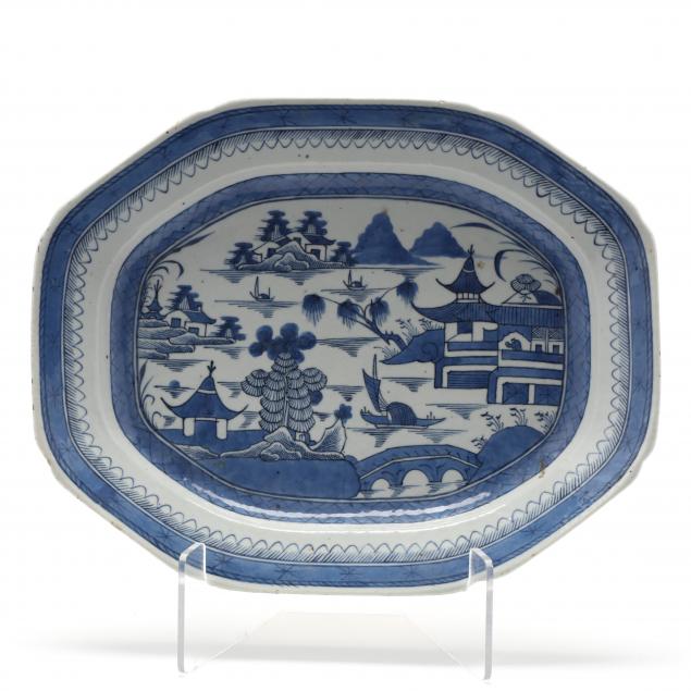19th century, porcelain hand painted with cobalt blue in the Canton pattern, octagonal shaped platter with dimpled corners, unglazed underside.