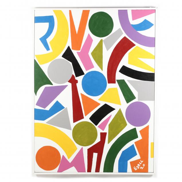 Ezell began painting everyday objects in the folk art tradition – household fixtures like jars of pickles and mayonnaise, farm animals, and church scenes. When he lost ninety five percent of his vision in one eye, he began to paint larger works that are abstract in composition but retain the same vibrant palate. Ezell’s work is popular at auctions, galleries, and antique dealers throughout the Southeast.