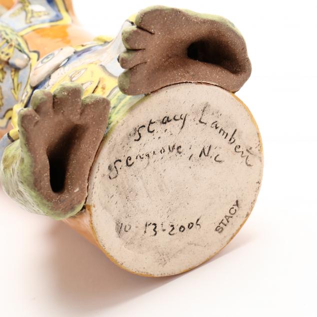 Tall upright toothy gator in a polychrome glaze with tattoo-like vignettes, verses on the reverse, the underside inscribed "Stacy Lambert 2005".