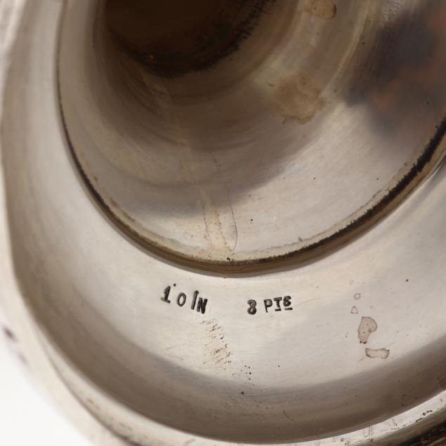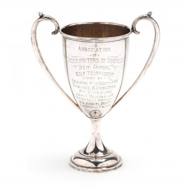 Mark of International, model number 966, a large two-handled cup with engraving to recto reading "Association of / Fire Underwriters of Norfolk, VA / Semi Annual / Golf Tournament / Won by / Edward P. Woodward / Richard B. Proctor / Wm R. Howard / John Cahill Jr. / George M. Gordon / Roland M. Bott / Andrew J. Heath," engraved to the verso "Hugh N. P. Tunstall / Charles McI. Tunstall."