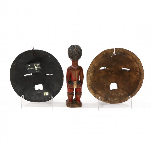 To include: two masks from Ghana, made of carved and painted wood with applied beadwork and brass inlays (12 in.); plus a Baule red-painted female figure from Ivory Coast, possibly with age (14.25 in.).