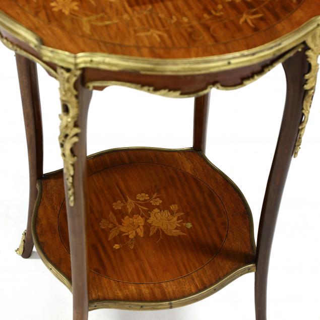 Early 20th century, mahogany and satinwood veneers with mixed wood inlays, shaped top with ormolu trim, raised on rounded cabriole legs with lower shelf, with repeating floral inlays.