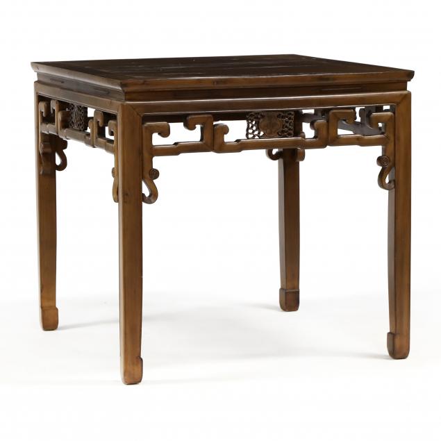 Square top with through tenon construction, pierced skirt, on straight legs with molded edge and stylized whorl feet.