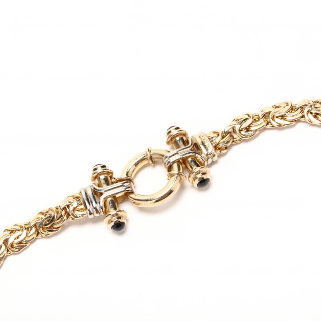 Flat Byzantine necklace completed with a bold spring ring clasp set with four round cabochon black onyx end caps, stamped AK 14K.
