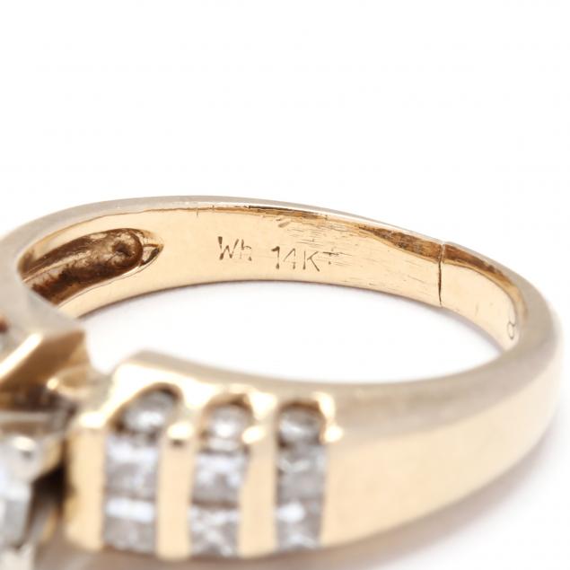 Ring centered with a prong set, princess cut diamond weighing approximately .44 carat (J color, SI2 clarity) with horizontal rows of channel set princess and full cut round diamonds weighing approximately .86 total carat (G-H color, SI clarity) on either side and with a tapered shank, stamped 14K.