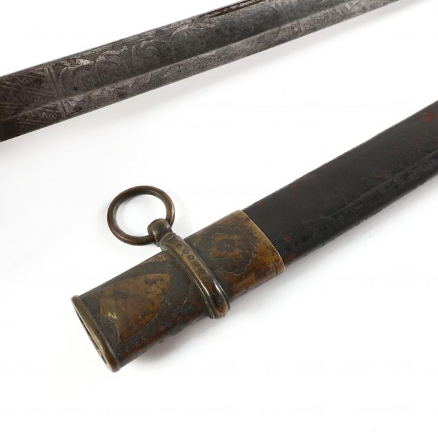 The ricasso stamped COLLINS & CO / HARTFORD / CONN / 1862, the retailer's name, "Hunt & Goodwin," is etched below, both sides of the 32.5 in. steel blade are etched with ornate scrolls and patriotic motifs, the grip wrapped with rayskin and secured with brass wire; the pommel is engraved with a custom Union shield and an additional shield is left blank for personalization below the scabbard's throat; the scabbard's drag engraved with a US and eagle motif.