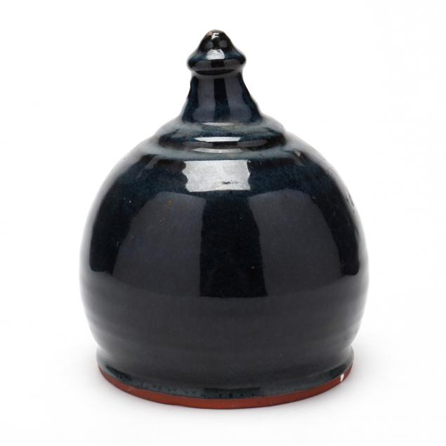 Composed of variegated blue glazed earthenware, high finial with aperture for hanging wire, large opening, applied loop perch, inscribed on the underside "Owens BH".