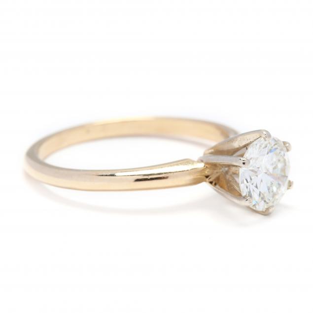 The round brilliant cut diamond (6.58 - 6.58 x 3.9 mm) weighing approximately 1.0 carat (L color, I2 clarity) prong set in white gold and with a yellow gold shank, stamped 14K.