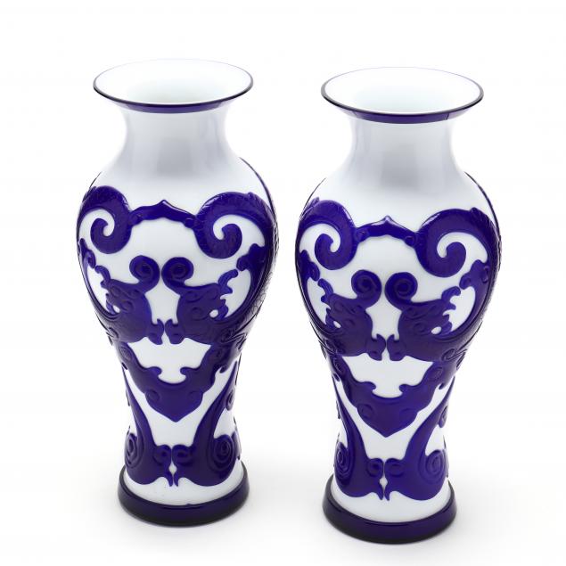 20th century, white ground with sapphire blue raised decoration of mythical animals in swirling pattern together with stylized