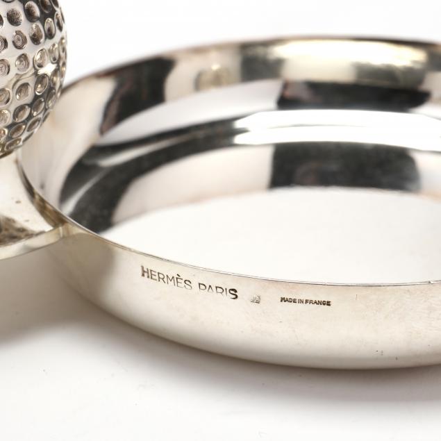 Silverplate, made in France, second half of the 20th century; the first a low dish with golf ball handle, marked "Hermes Paris" to base and with silverplate marks to handle (LOA 6.5 in.) (light scratching); the second a double dish with golf ball handle to center marked "Hermes Paris" to top, one dish with additional markings (LOA 10.25 in.) (possibly re-plated). No monograms or engravings.