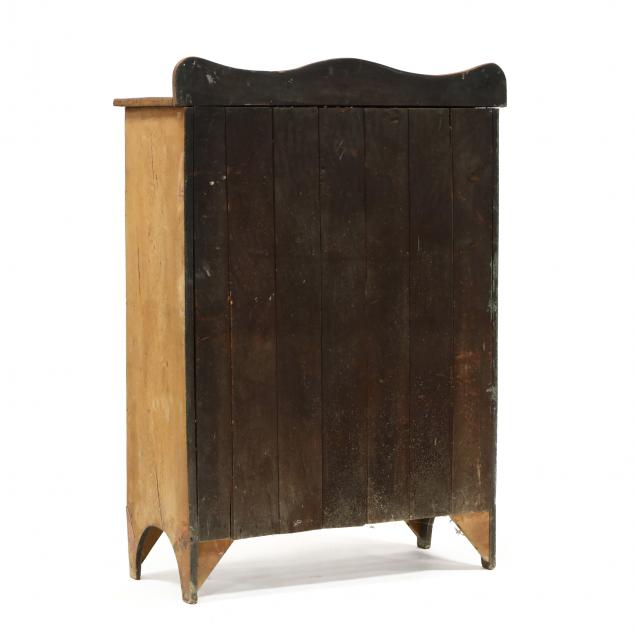 Late 19th century, applied shaped backsplash, two lipped drawers with chamfered edge over two hinged paneled doors with six punched tins, shelved interior, crescent moon shaped feet.
