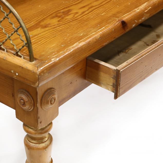 Late 20th century, two part form, two tier shelf with brass wire supports, lower table with two drawers supported by ring turned legs and stretcher base.