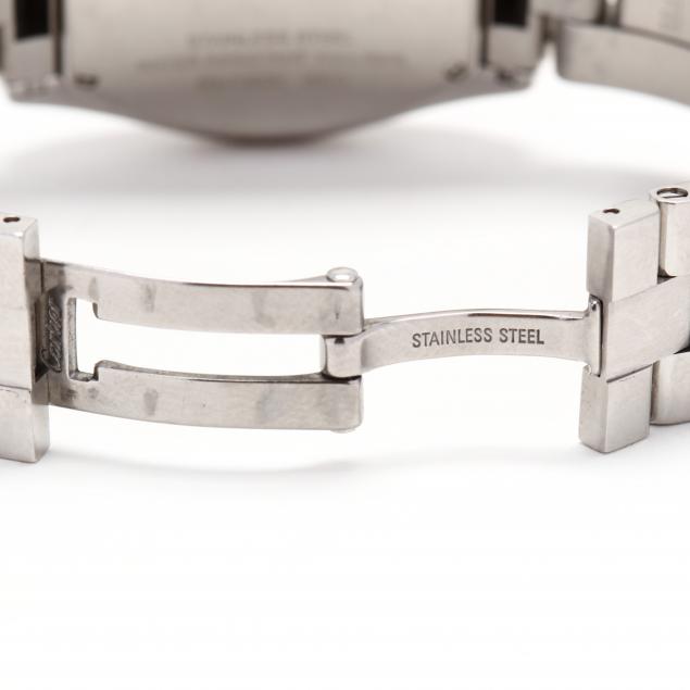 Quartz movement, the tonneau shaped case with signed silver tone dial, with black Roman numeral hour markers and luminescent hands, with date aperture at the 3:00 hour, completed with signed bracelet band and deployment clasp, case back signed and marked 550786CE / 2675. Accompanied with a Cartier black strap band with signed deployment clasp (band with wear).