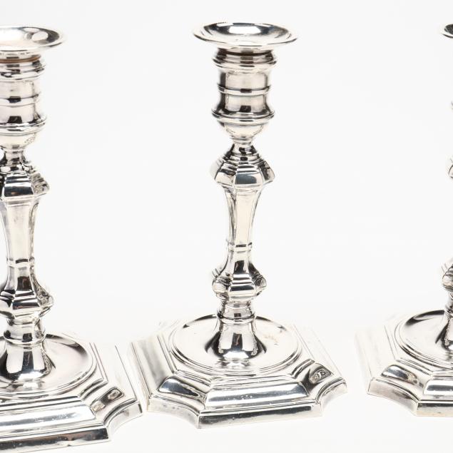 Scattered pinpoint denting; wax residue to candle cups; one with small stable seam split on standard.