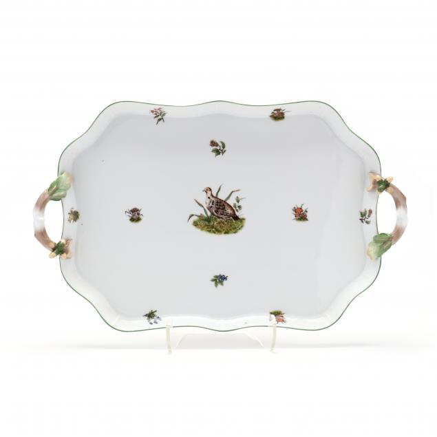 Shaped rectangular tray with oak branch form handles, centered with a hand-painted partridge.