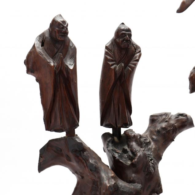 19th century, a large figure is featured wearing platform boots and having a long beard and mustache, he wears an official's hat and carries a staff in his left hand, his face is carved with an intense expression, bulging eyes, mouth slightly open showing teeth and tongue, his clothing is comprised of the shaped rootwood, giving texture, he stands atop various pieces of rootwood secured together, and to his right are two monks or sages standing with hands folded in prayer.