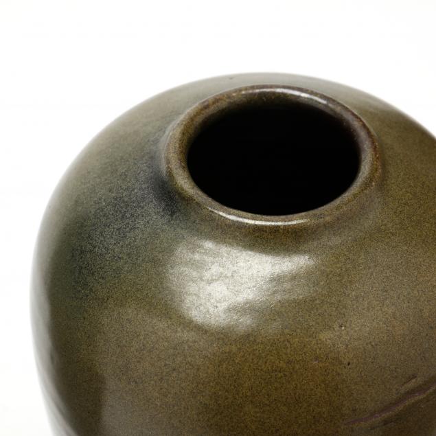 Three forms including a tall egg vase, a ring-turned vase (8.5 in.) ( minute white dots); a shoulder vase (5.5 x 6.75 in.), all with Master Potter stamp.